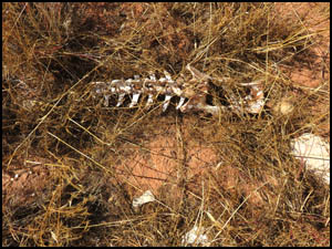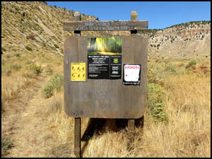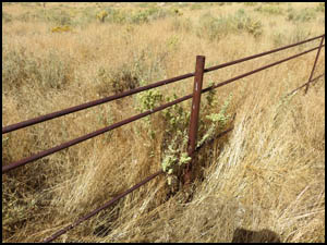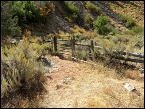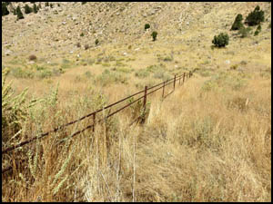 I make my way from the house across the drainage ditch and to the other side where Richard is waiting. Along the way, I pass some animal bones. We pass a pretty nice Forest Service sign and then come to a wooden fence. There is a locked gate in the fence and a way for hikers to pass through the fence without allowing cattle through. There is also a wooden fence on the other side of the water way. It appears to us that barbed wire was strung across the stream between the two fences at one time, so maybe the house owner kept cattle or sheep in the field near his house.