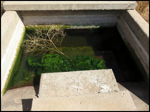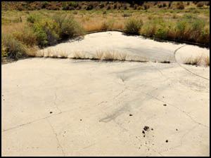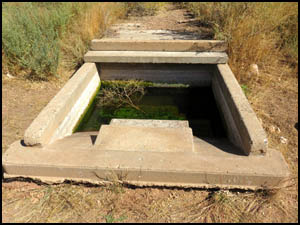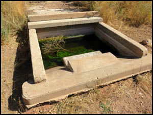 My initial thought was that getting water to this dry location would have been quite difficult. Then I found a unique semi-circular concrete structure just outside the house. It was about fifty feet in diameter and sloped gently toward the small end, which does not show in these two pictures, but is where I am standing. It had curbing around it to prevent rain water from flowing out of the surface. The catch basin above was positioned and sloped so that water would flow into the holding basin below, which was full of water. I wonder how they got all the concrete for these two structures down here. The workmanship on both concrete structures was excellent.