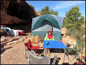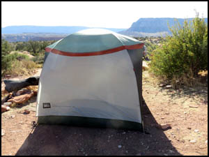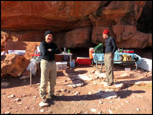 The wind was again quite strong all night long. It is cool this morning, but fortunately the temperature last night was no where near the 23 degrees the weatherman was forecasting. After breakfast, Richard and I walk down to the lower campsites and around the corner where a family is camped. I find a glove on the ground and ask if it belongs to them. A little girl around twelve years old is elated that I found her lost glove. These people have some large tents, one of the benefits of car camping. They also have a Coleman gasoline stove, something I have not seen in many years. The two guys in the center picture below indicate they are going to hike part way down the Lava Falls Trail later today.