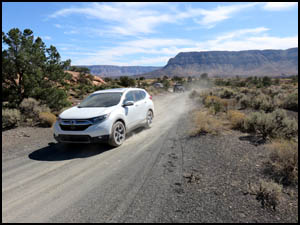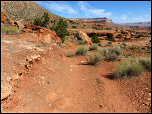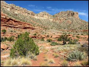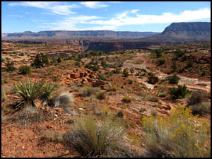 We go back to camp and relax a while. We decide to hike some on the Tuckup Trail after lunch. The Park Service indicates that the trail is 60 miles long. The trail begins just a mile or so north of our campsite and then proceeds east, so we decide to just walk there. On the way, a bunch of cars come by after visiting the Toroweap Overlook. All over the road surface on the way to Tuckup we see lots of evidence of dripping transmission fluid from that girl's stalled car. We also expected to see her car at the side of the road again, but she must have finally gotten a tow truck to come for it. The older volunteer at the Ranger station told us it costs $1,000 for a tow truck to come out here. The beginning of the Tuckup Trail is well defined and very easy walking. I understand that the trail becomes more faint the farther east you go.
