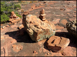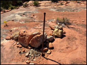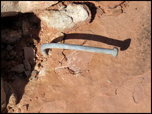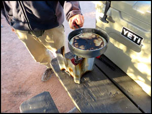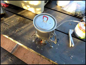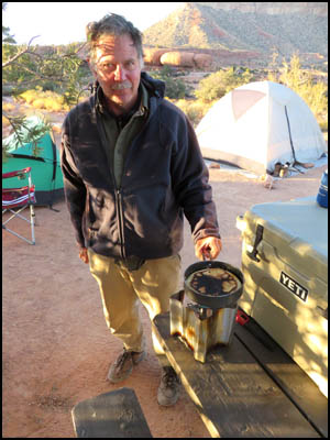 We pass some cairns and an interesting rock along the way. The cairns in the first picture below show another way back to camp. We agree to go that way on our return. After walking a couple of miles, we rest a while at the far end of the canyon before turning around and heading back. After turning onto the cairned route shown above, we come across a drilling stem and a galvanized bolt, both embedded in the rock. We have not seen any mining activity in the area and have no idea what these things are doing here. Richard is fixing pizza for supper. He learned that trick from one of our mutual hiking friends, Adrian Jantzi, also known as the "Pizza Man." I am heating water for my freeze dried meal on the $19 camping stove with piezo starter I bought on Amazon. I'm impressed with this stove, but its large size probably only makes it suitable for car camping. I use a very small Brunton Raptor with piezo starter for my hiking stove. It is no longer made. My Yeti cooler has held ice for three days, just as they advertised it would.