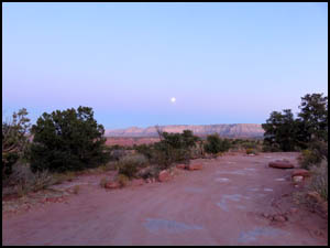 This has been a very nice three days. This is the first trip of this length I have taken to the Canyon that was entirely car camping. The moon is nearly full and is out early tonight. MAIN INDEX | HIKING INDEX | BACK TO DAY 2 | FORWARD TO POSTSCRIPT