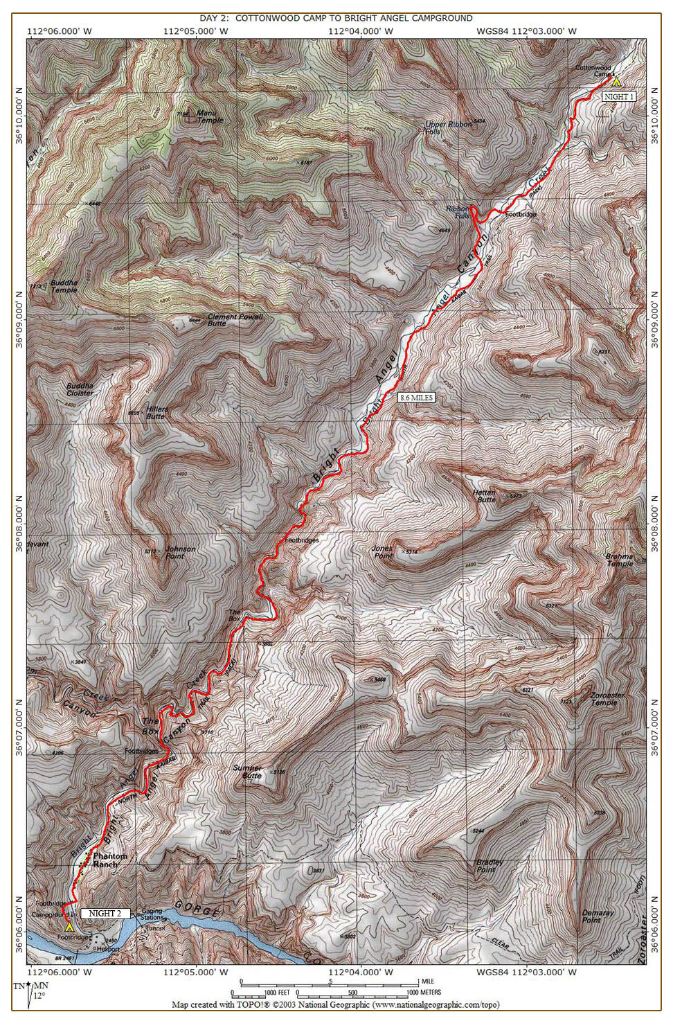 We eat, pack, and leave camp around 8:50. In about an hour, we reach the Ribbon Falls cutoff trail. I have heard that the bridge going across the creek is closed. It's worse than that. The bridge is gone! Apparently, a few years ago the Park Service felt the bridge was unsafe and completely removed it. That is going to make it very challenging for us to get across the creek to see Ribbon Falls. We climb down from where the bridge was and make our way through the brush until we reach the creek. The water in the creek is a little deep and is flowing swiftly. We spend about twenty minutes looking for a safe way to cross the creek, but do not find one. We eventually give up, which may be a good thing. We later meet two guys who were soaked from head to foot after falling into the creek trying to cross it. We return to the trail and head south. Unfortunately, we now have to climb and descend "Asinine Hill." It is appropriately named because you have to climb this very steep hill, only to have to make a steep descent back to your original elevation. A little further down the trail we come to another sign indicating that Ribbon Falls can be accessed by crossing the creek here and backtracking to the Falls. Since we wasted a lot time trying to cross the creek earlier, we decide to skip Ribbon Falls and continue on. I tell Beth and Curt to go on ahead as they will be much faster than I will. I trudge along, eventually coming to the first of several bridges I have to cross. Just a little later I have to cross a small rock slide area, which is no problem at all. This area of the Canyon is called "The Box" due to its high walls. New hikers to this area probably feel like ants trapped at the bottom of a box. I cross two more bridges and seem to be making a little headway. I sit down on a low rock wall beside the trail and have lunch. I needed that break anyway. After crossing two more bridges, I feel I'm getting pretty close to Phantom Ranch. When you come to these trail signs, you know you are really close. I round the corner of the Canteen at Phantom Ranch and find Beth and Curt sitting on a bench. They got here a couple of hours ago and have already staked out a nice campsite. Like yesterday, I am pretty tired, so a more lengthy break is now in order. Beth goes and gets me some lemonade at the side window. After my extended break, we head to camp and I set up my tent. While I rest more at camp, Beth is taking Curt over to see the Kaibab Suspension Bride, often called the "Black Bridge." It was built in 1928 to replace a frail and poorly built wooden suspension bridge. In order to get the one-ton, 1.5 inch suspension cables to the bridge build site, the Park Service enlisted 42 men, mostly Havasupai Indians, to carry each cable on their shoulders and snake their way down the South Kaibab Trail. Click here to see a picture of the men carrying the cables. The bridge was designed to carry a load of 750,000 pounds. Click here to see a picture of both suspension bridges before the original bridge was torn down.