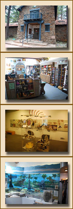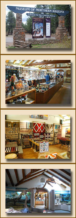 The Museum of Northern Arizona is located on Highway 180 (N. Fort Valley Road) on the north side of Flagstaff. It is open daily from 9 A.M. to 5 P.M. Entrance fees are $15 for adults and $10 for children. In its ninth decade, it features nine permanent exhibit galleries and yearly changing exhibits covering the Colorado Plateau, the Grand Canyon, and the Four Corners region, all of which will enhance your experience of the richly diverse cultures, landscapes, and ecology of the Plateau. The permanent exhibit galleries include the Geology Gallery, the Archaeology Gallery, the Ethnology Gallery, the Kiva Gallery, the Navajo Weaving Gallery, and the Babbitt Gallery. The day I was there it had an excellent exhibit on the Therizinosaur or Sickle-claw Dinosaur. They have a bookstore and large museum gift shop. Their new Easton Collection Center, a state-of-the-art 17,000 square foot facility, was dedicated June 21, 2009, and will house items from their extensive collections. There are self-guided tours or weekly museum tours every Saturday at 2 P.M. They offer unparalleled opportunities to discover and explore the Colorado Plateau with their Ventures Tours. For more information on the museum or one of the Venture Tours, visit their website at: http://www.musnaz.org/. |