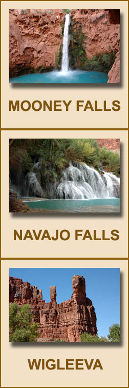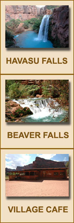 Some of the prettiest waterfalls anywhere are located in Havasu Canyon in the western part of the Grand Canyon. Also there is the Village of Supai, home to the Havasupai Indian Tribe. Havasupai translates in English to "People of the Blue-Green Waters." The area is accessible only by hiking, horseback, or helicopter. Each year thousands of people travel there to see the beautiful waterfalls, the four primary ones being Mooney Falls, Havasu Falls, Navajo Falls, and Beaver Falls. As you approach the Village, you come to stone pillars high on the hillside. These are called "Wigleeva" and are considered to be the Guardian Spirits of the Havasupai people. Their legend says that if these ever fall, the Canyon walls will close and the entire Village will be destroyed. The Village has a cafe, store, post office, school, and lodge. Tourism is one of their primary sources of income. |